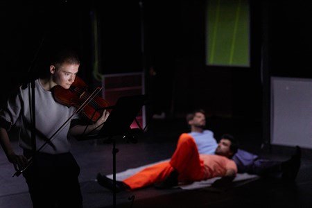 MusikerInnen üben jahrelang komplexe Bewegungen, wachsen in neue Haltungen, verschmelzen mit ihren Instrumenten. Im Zuge zunehmender Selbstoptimierung verwuchert die Arbeit unentwirrbar mit dem Leben. Die durch virtuose Technologien veränderten Körper bewohnen den Konzertraum als gleichzeitig fremden und merkwürdig vertrauten Planeten. Ort des Geschehens ist ein multifunktionales Gerüst, das im Gegensatz zur Universalität eines standardisierten Körpermodells von Vitruv oder Le Corbusier die individuellen Proportionen der jungen Geigerin zum Modell des Bühnenbilds macht. Das transdisziplinäre Kollektiv Mycelium nimmt die allmähliche musikalische Verwandlung einer Geigerin und zweier Schlagzeuger zum Anlass eines ungewöhnlichen Abends zwischen Konzert, Tableau, Ausstellung, Laboratorium, Glamrock und Choreografie.