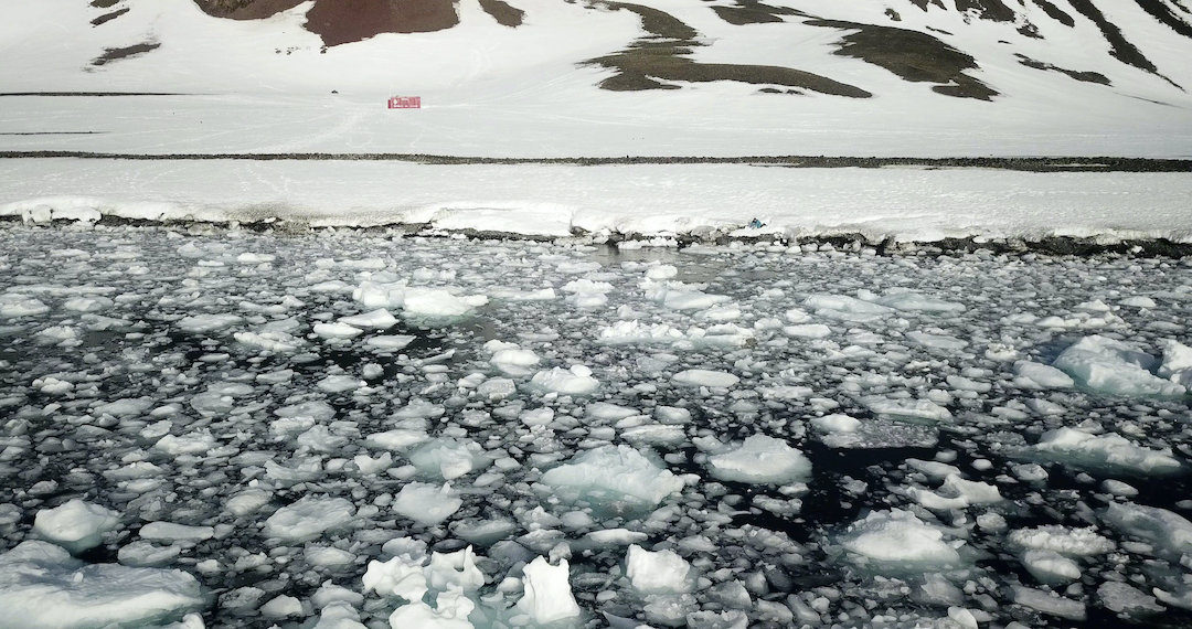 Stellen wir uns vor: Ein schnatternd-knatterndes Alien in einem unbekannten Flugobjekt erkundet die Antarktis. Weder ahnt es, dass es sich hierbei um einen klimawandelbedingt verschwindenden Landstrich handelt, noch weiß es, dass der Rest der Welt etwas anders aussieht. Es wundert sich also, das Alien, und uns, die wir seinen zwischen Neugier, Erstaunen und Frustration pendelnden Drohnenflugfilm betrachten, dämmert mehr als nur der Zusammenhang zwischen Meteoriten, Dinosauriern und unewigem Eis. Möglicherweise sind dies ja bereits die Bilder der Zukunft: Einer der letzten Überlebenden zieht einen Palmwedel aus dem Eiswürfel- wasser und die Pinguine wundern sich. (Alexandra Seitz)