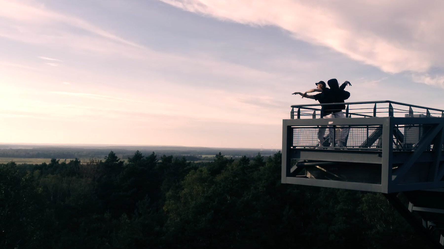 POINTS OF DEPARTURE (POD) combines footage from the first and third part of the live performance "POD Hyphen" with voice-overs by Jen Rosenblit from the rehearsal process as well as newly filmed footage of Stephane "Peeps" Moun and Ian Kaler in a practice session at Steinitzer Treppe, an open-air location in Berlin Brandenburg.